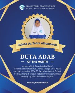 Selamat atas terpilihnya Ananda Zainab Az Zahra Alhumairoh sebagai Duta Adab periode November 2024 SD JannahQu Islamic School. Semoga menjadi teladan kebaikan untuk senantiasa menjunjung tinggi nilai-nilai adab yang baik.